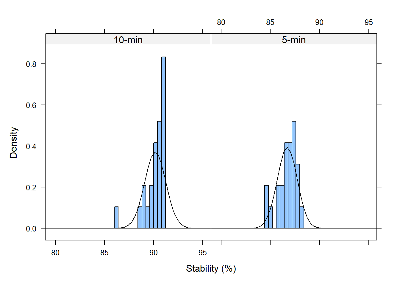 library(lattice)histogram( ~ stability | time, data = my_data,xlab ="Stability (%)", type ="density",breaks =seq(from =80, to =95, by =0.4),panel =function(x, ...) {panel.histogram(x, ...)panel.mathdensity(dmath = dnorm, col ="black",args =list(mean=mean(x),sd=sd(x))) } )